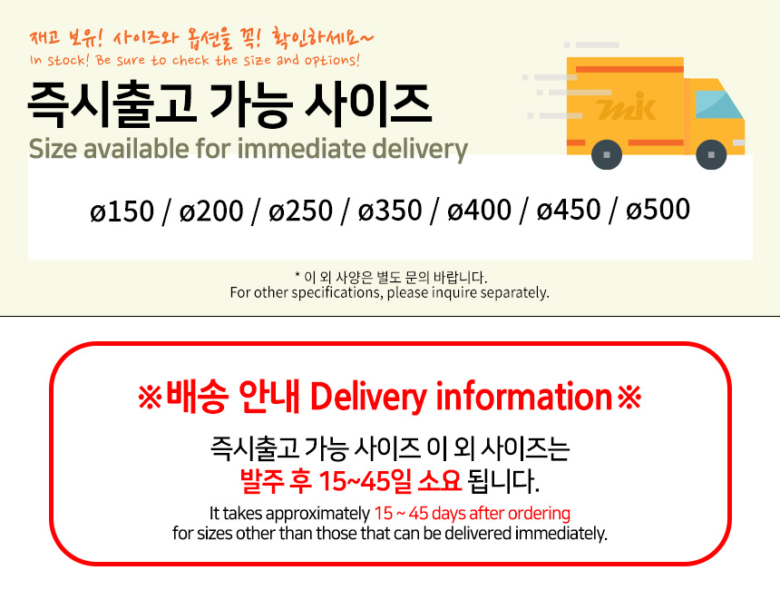 즉시출고 사양 외 사이즈는 발주 후 약 15일~45일 소요됩니다.