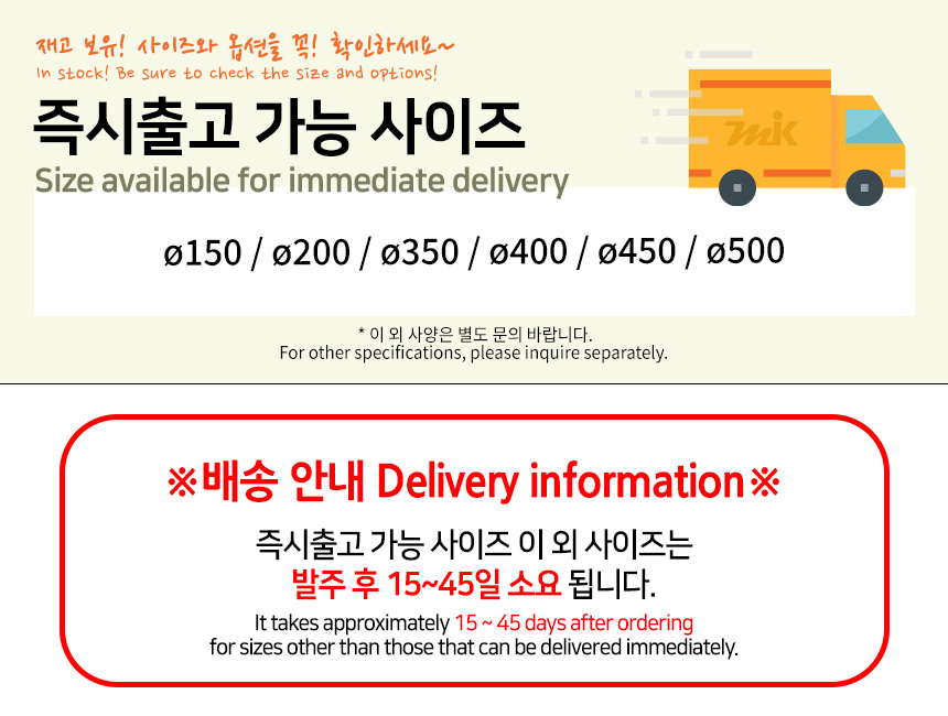 즉시출고 가능한 사양 외 사이즈는 발주 후 약 15일~45일 소요됩니다.